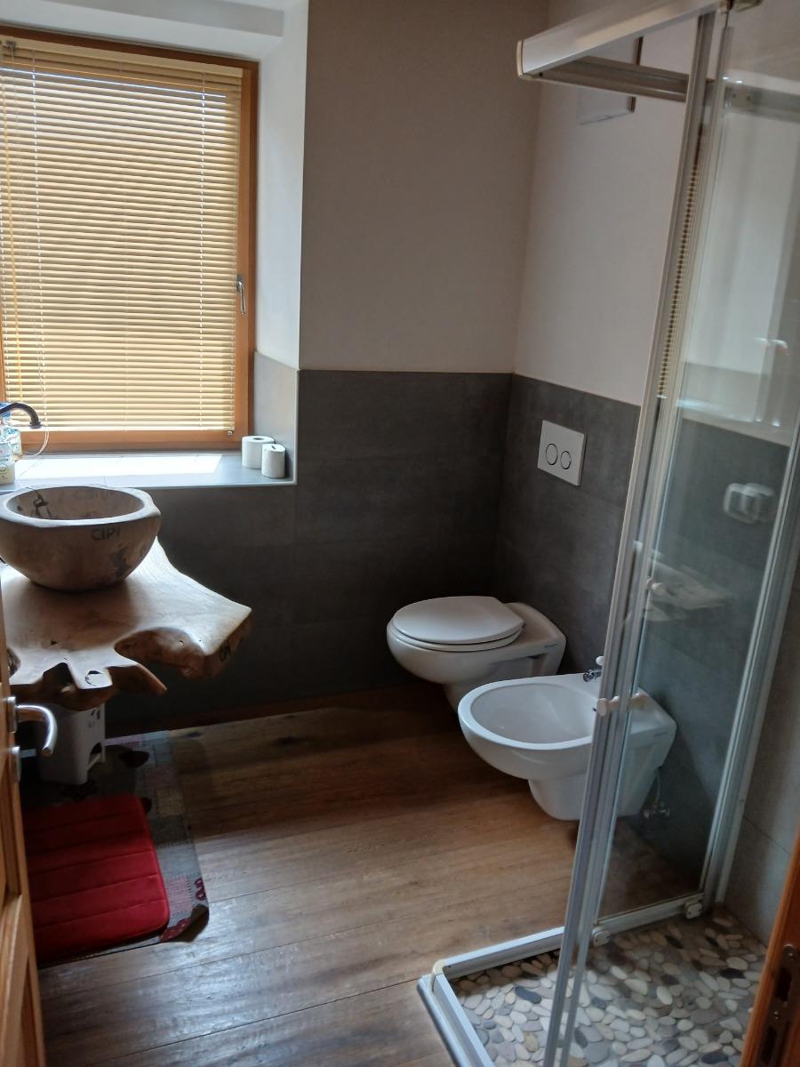 3. ROMANTIC: a room immersed in an ancient Stube with a private bathroom, a large shower, bidet, towels, and hairdryer.